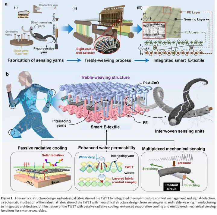 Smart e-textiles have shown unique advantages in mediating this interactions with the world. Despite substantial progress, the practical application of e-textiles in wearable technologies remains limited by challenging tasks of integrating both optimal electrical performance and thermal-moisture comfort into a single fabric, particularly at industrial scales. Herein, leveraging a meta-textile structural design, a smart treble-weaving electronic textile (TWET) that combines highly sensitive sensing capabilities with radiative cooling is developed and enhanced sweat management through meta-yarn junction blocks forming hierarchical fabric architectures. Unlike conventional layered fabrics by simply compositing different functional layers, the TWET fabric integrates multimodal sensing, optical and moisture management into an all-in-one construction and leverages its interlacing structures as conduits for heat and moisture transmission, which contributes to outstanding thermal-moisture comfort. Moreover, it is demonstrated that the TWET performs robust monitoring and perception of human motion signals against heat stress. It is also shown that frequency-domain signals resulting from Fourier transformation can interpret and distinguish temporal-spatial features of regulating walking and stepping in place. This meta-textile hierarchical-assembly concept enables integrated thermal and moisture management in next-generation e-textiles, offering great potential for scalable production and multifunctionality through the precise engineering of meta-structures.